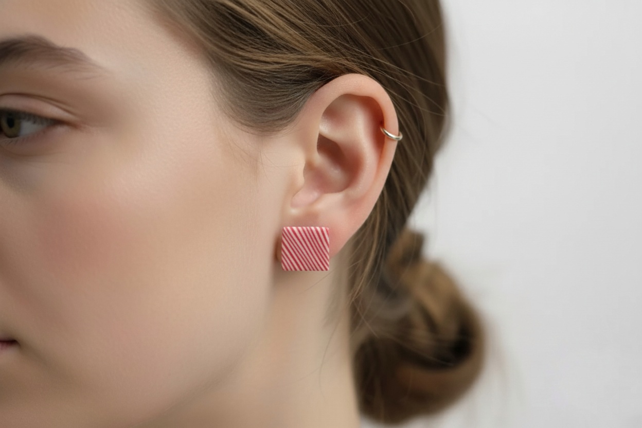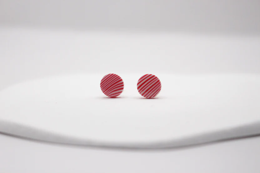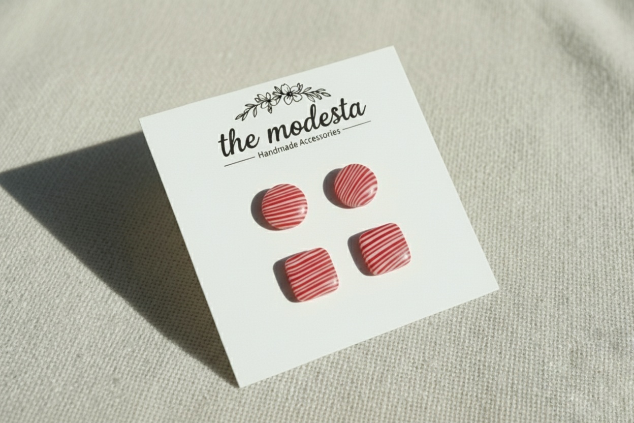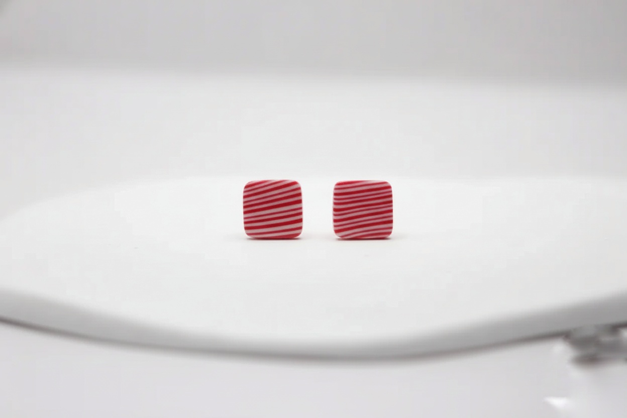 This charming set includes two pairs of handmade polymer clay stud earrings, both featuring a delightful red and white peppermint swirl design. One pair is classic round, while the other offers a modern square shape, perfect for mixing and matching or gifting.