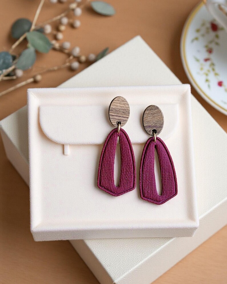 Elegant drop earrings featuring a natural wood oval stud and a bold, open-design geometric pendant wrapped in textured burgundy fabric. Lightweight and unique, they are perfect for a sophisticated look.